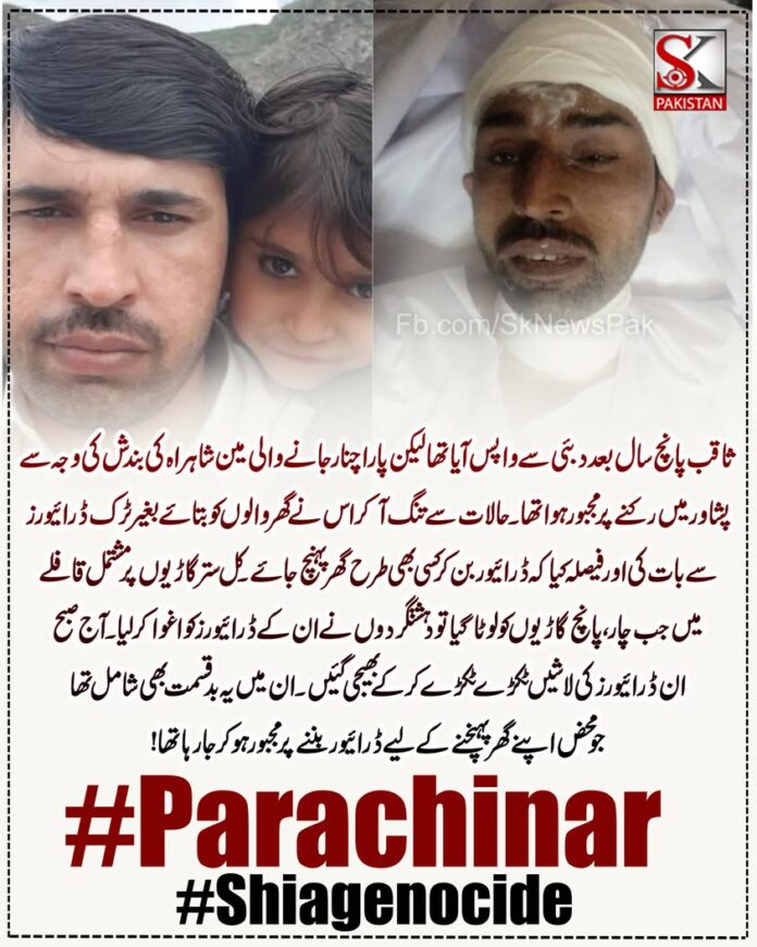 ثاقب پانچ سال بعد دبئی سے واپس آیا تھا لیکن پاراچنار جانے والی مین شاہراہ کی بندش کی وجہ سے پشاور میں رکنے پر مجبور ہوا تھا۔ حالات سے تنگ آ کر اس نے گھر والوں کو بتائے بغیر ٹرک ڈرائیورز